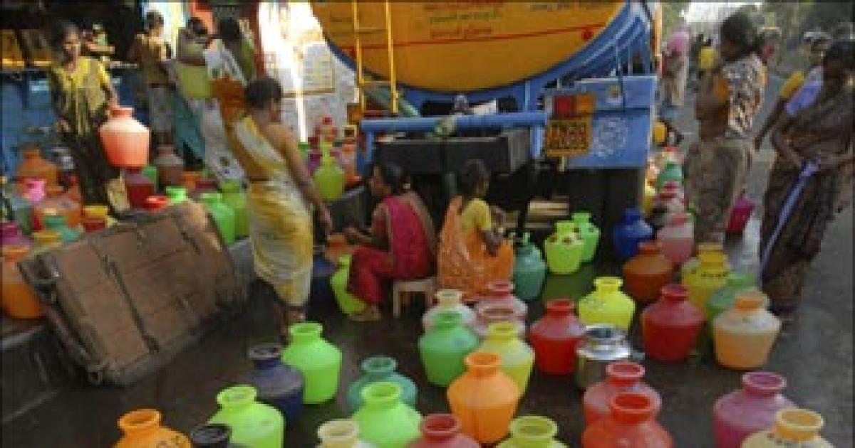 Image: Women wait to fill their containers with drinking water supplied from the municipal corporation tanker.