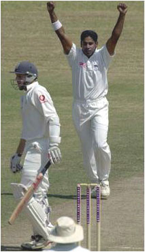 Sri Lanka paceman Chimanda Vaas exults after having Michael Atherton leg before.